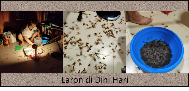Terus terang dalam pikiran Rm. Bambang muncul pertanyaan "Kapan meneh ya isa entuk santapan di luar diet?" (Kapan lagi bisa menyantap kuliner di luar diet?). Seperti biasa pada Kamis itu Rm. Bambang tidur malam tanpa kesulitan. Tetapi pada waktu tidur dia seperti mimpi dihinggapi kupu-kupu. Dia mencoba untuk mengusir dengan tangannya. Ternyata dia tidak mimpi. Memang ada yang menghinggapi kepala yang tak tertutup selimut. Ketika membuka mata dan duduk, ternyata tempat tidur dan lantai kamar penuh dengan laron. Maklumlah, dua lampu tetap hidup dengan terang di kamarnya. Ketika menengok jam, ternyata sudah jam 02.30. Ini berarti sudah masuk hari Jumat 1 Desember 2023. Rm. Bambang pindah ke kursi roda dan keluar kamar. Dia membuka kamar Rm. Tri Hartono dan meminta bantuan Mas Abas yang menjaga Rm. Tri. Mas Abas mengambil sapu dan mangkuk plastik cukup besar. Dengan sapu laron-laron dikumpulkan dan dimasukkan dalam mangkuk. Kemudian lampu kamar dimatikan dan diganti dengan lampu baca yang diletakkan di lantai. Laron-laron baru datang mengumpul di bawah lampu. Mas Abas meraup dengan telapak tangannya dan memasukkan dalam mangkuk. "Engko digoreng nganggo endhog ya. Gawe dadar laron" (Nanti digoreng dengan telor ya. Buat dadar laron) kata Rm. Bambang yang disahut oleh Mas Abas "Nggih. Mangke nyuwun tulung Mas Hari" (Ya. Nanti minta tolong Mas Hari). Inilah mengapa saat makan pagi dan siang tersedia teor dadar penuh laron. PESTA LAGIIIIIII.